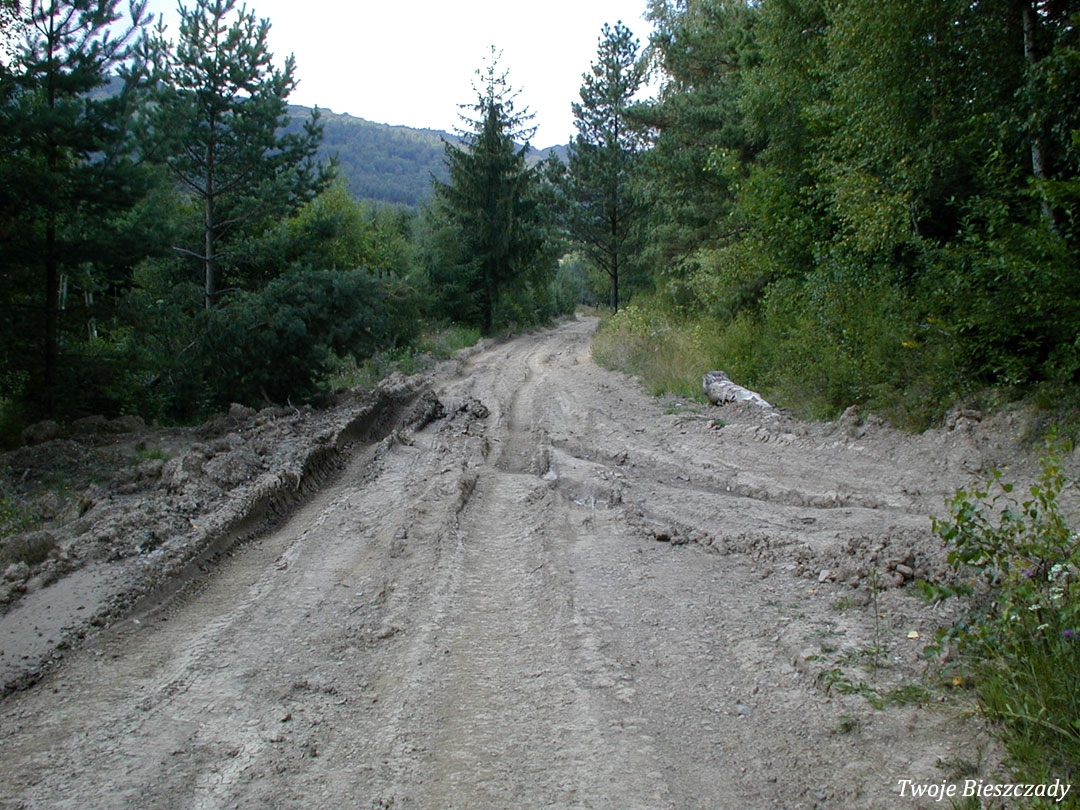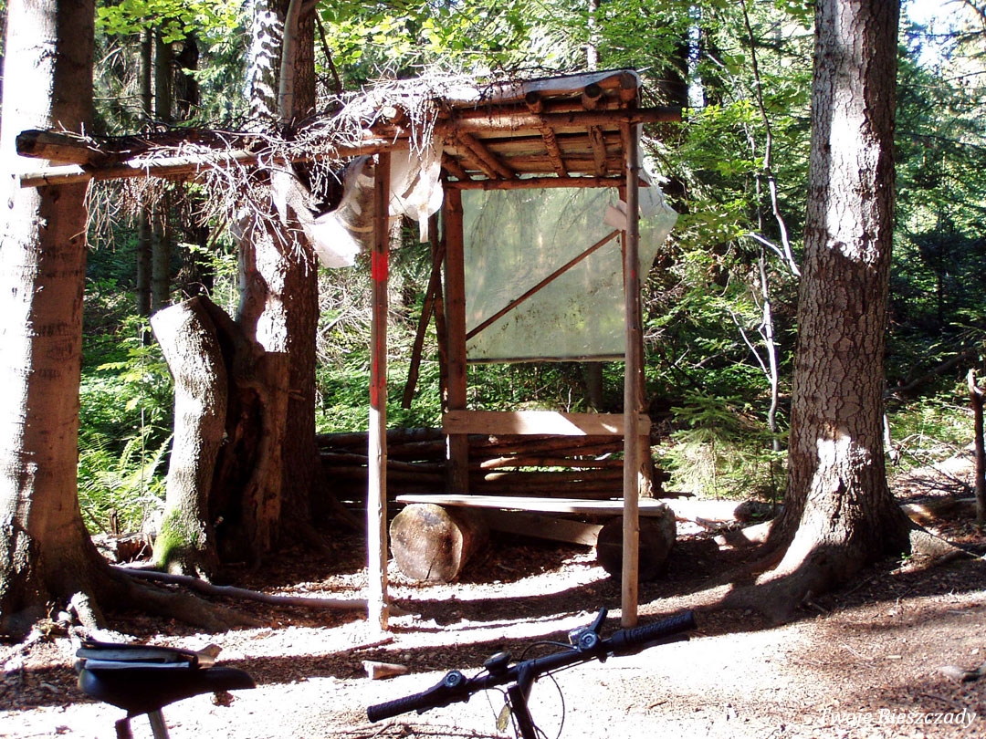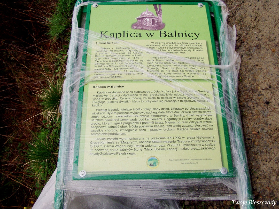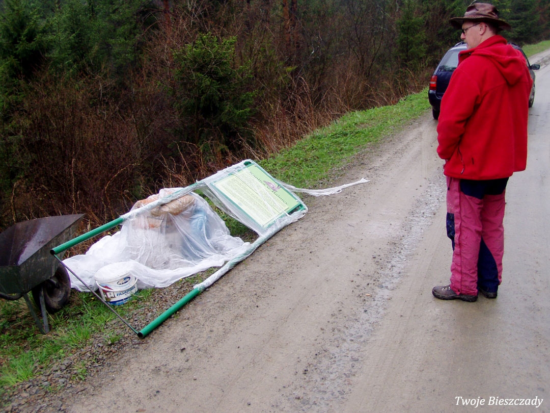 Balnica, droga na terenie dawnej wsi, montaż tablicy z informacją o kaplicy na trasie ściezki turystycznej. Na zdjęciu Wojtek "Kiju" Gosztyła, 2008 (foto: P. Szechyński)