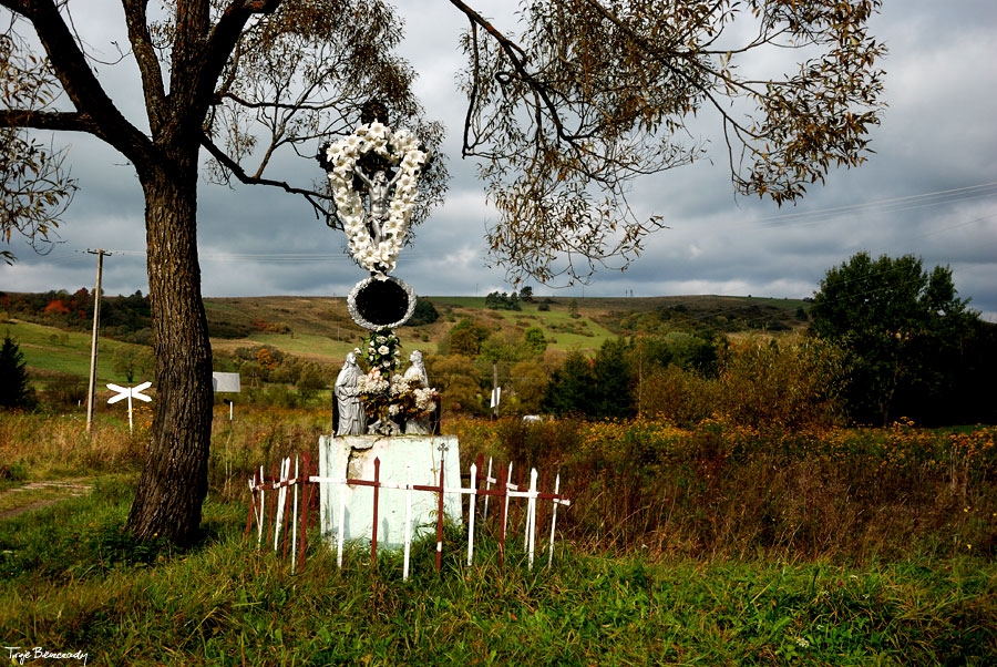 Beniowa, oryginalny cokół i krzyż przydrożny Iwana Batko z 1888r. Zdjęcie z 30.09.1995 (foto: Andrzej Machowski)